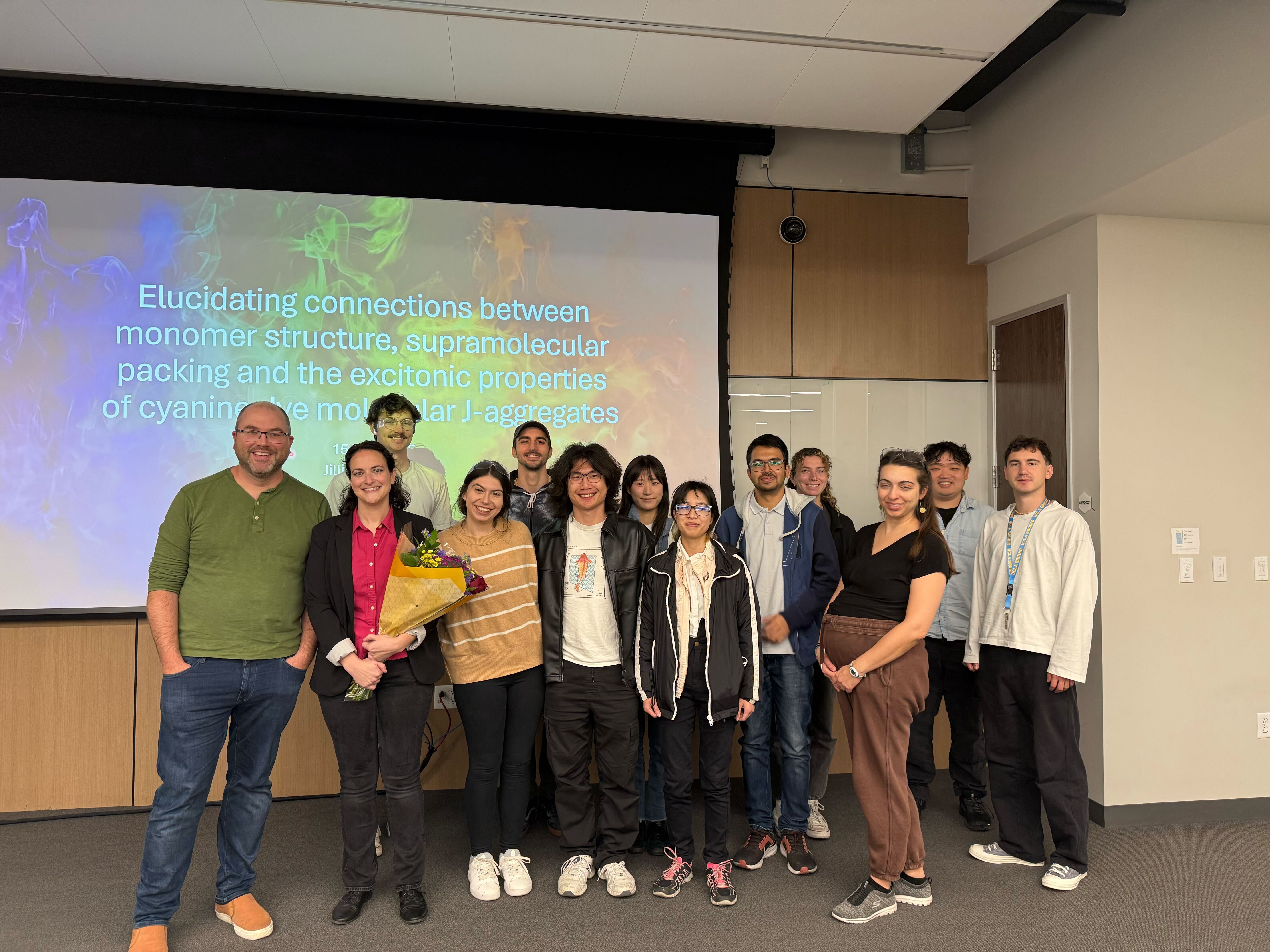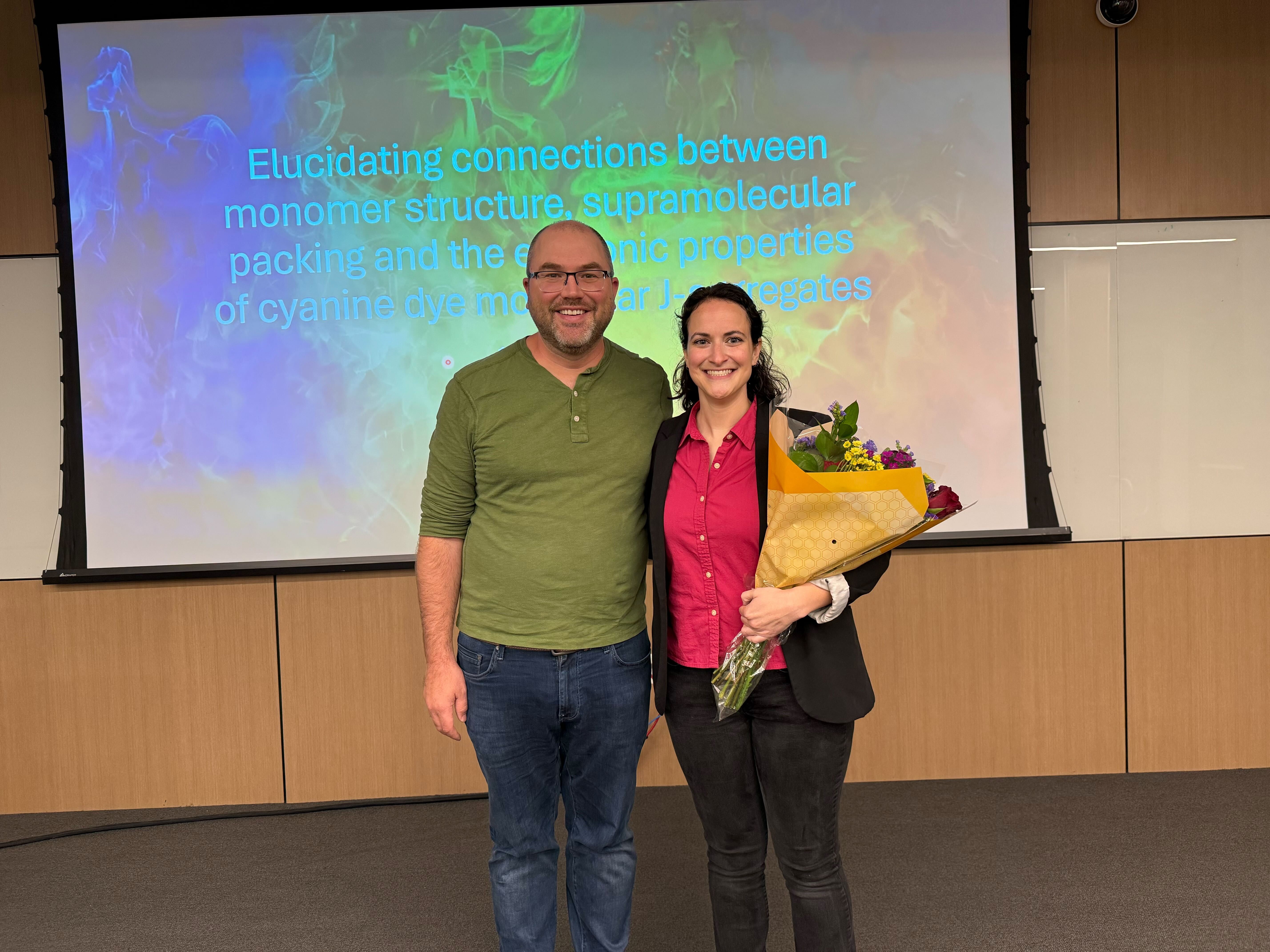 5/12/2025 Congratulations to Jill on her exit seminar: “Elucidating Connections Between Monomer Structure, Supramolecular Packing and the Excitonic Properties of Cyanine Dyes Molecular J-Aggregates”!